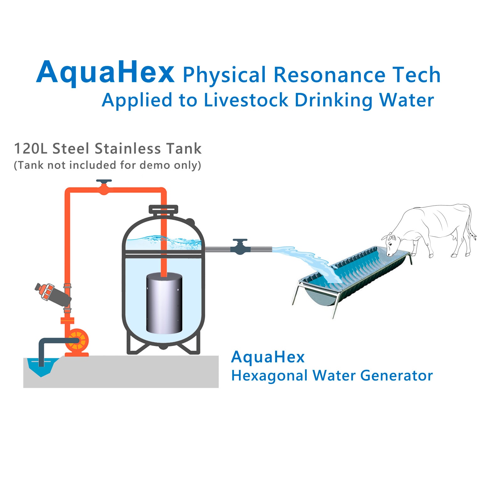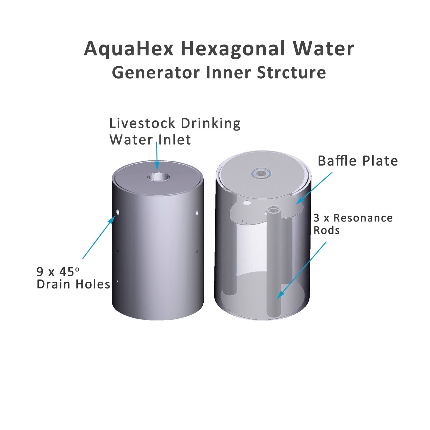 Hexagonal water is highly suitable for livestock and poultry consumption due to its energy and vitality, comparable to natural hexagonal water found in melting snow from the Alps or the Caucasus—known for having the highest concentration of hexagonal clusters in nature. Water processed through the AquaHex Hexagonal Water Generator breaks down into ultra-small molecular clusters. These clusters, with their hexagonal structure, are recognized by cells as "bio-friendly."
